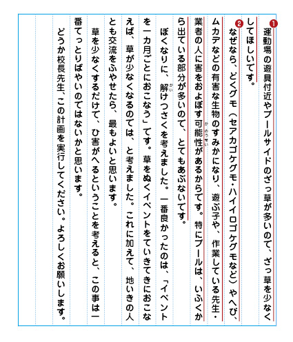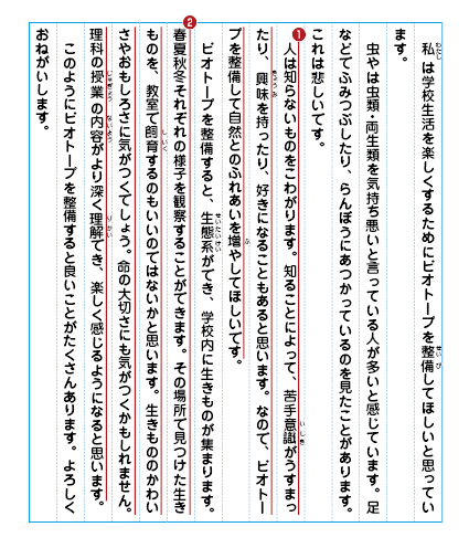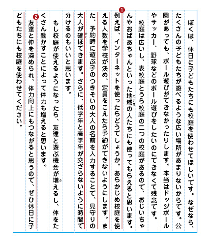 2:お願いする理由を具体的に書けているね。いろいろな立場の人のことを考えた、納得(なっとく)できる理由だと思ったよ。 |