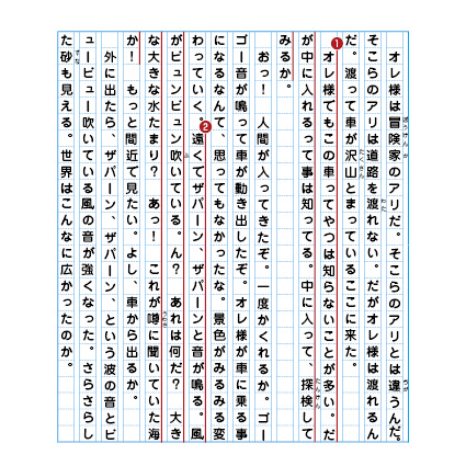 2:擬音語(ぎおんご)やたとえを使いながら、アリから見た海を表現(ひょうげん)してくれました。物語に引きこまれる、すてきな表現ですね。