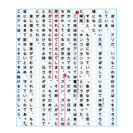 1:チャイムを「警戒音」と表現するのがおもしろいな。校庭にいるアリからしたら、たしかにそうなのかも。