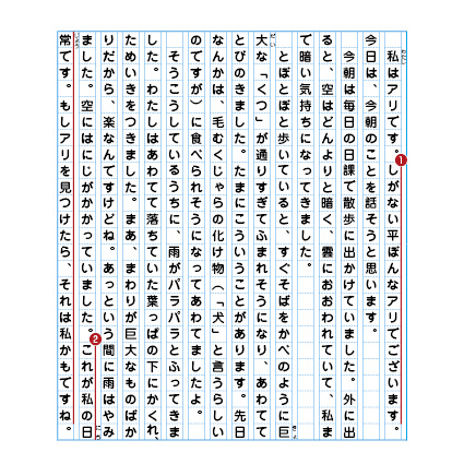 | アリになりきって、アリの視点(してん)で物語を書きましょう。ただし、アリの目から見た人間や人間の世界を必ずもりこみましょう。 |