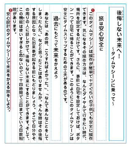 | あなたは世界で初めて、過去(かこ)や未来を自由に行き来できるタイムマシーンを発明しました。さっそくこれを販売(はんばい)しようと思います。このタイムマシーンを宣伝(せんでん)する広告を書きましょう。 |
