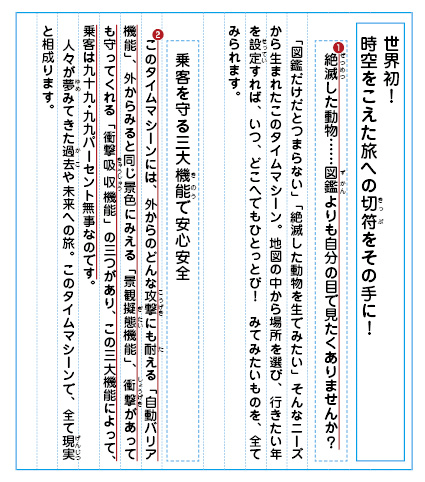 2:機能(きのう)が具体的に考えられていてすごいな。簡潔(かんけつ)でわかりやすい説明だから、タイムマシーンについてよくわかったよ。 |