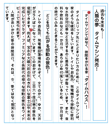 てんさく問題の「しょうかいしてもよい」のところに必ずチェックを入れよう。| 今回は、タイムマシーンという架空の商品の広告を作るという課題です。実際にはない商品ですから、商品の内容を自分で考え、文章にしなければなりません。また、広告の読み手を引きつける表現も考えていきます。この課題をとおして、想像したことを読み手に伝える力や、印象的な言葉でアピールする力を身につけることをねらいとしています。 |