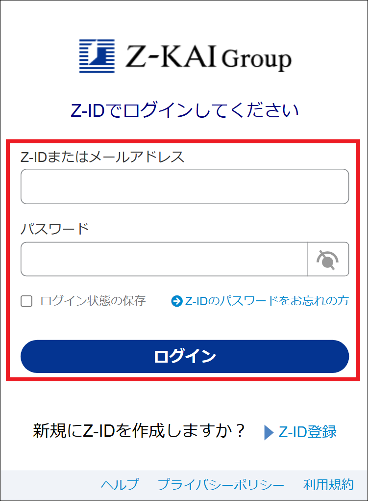 - その他、Z-ID登録・ログインでお困りの場合は、ログイン画面の「ヘルプ」をご覧ください。