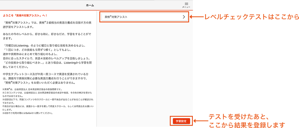 ■はじめに「レベルチェックテスト」を受けて、「学習設定」を行いましょう