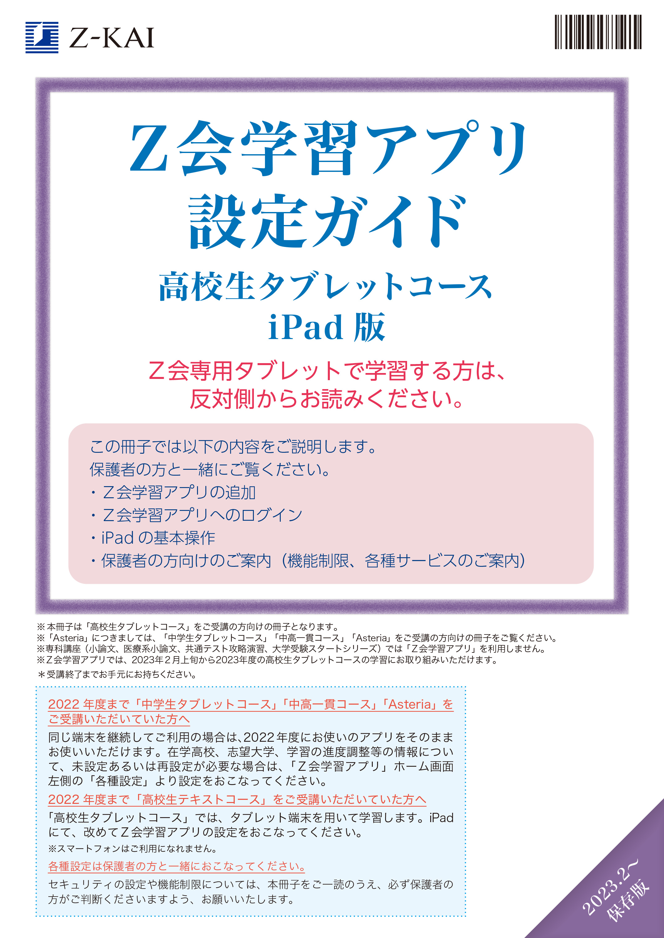 冊子でご提供の「Z会学習アプリ設定ガイド」は下記からも閲覧できます。