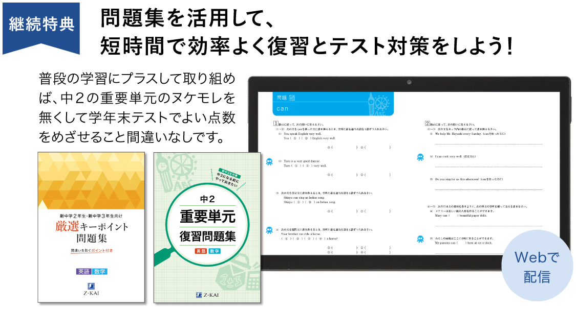 中学1年生から継続している新中学3年生に限り、受講講座をそのまま引き継いでご受講いただけます。該当の方は、Z会Webサイトに記載の金額とは異なりますのでご注意ください。