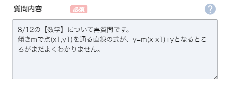 その際、「質問内容」の本文内に「●/●(日付)の【教科】について再質問です」とご入力ください。