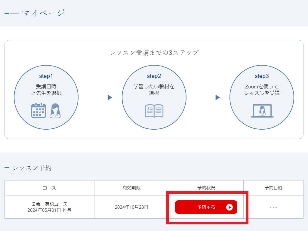 ③教材確定:教材を選択したら、「レッスンを予約する」を押して予約を完了させてください。