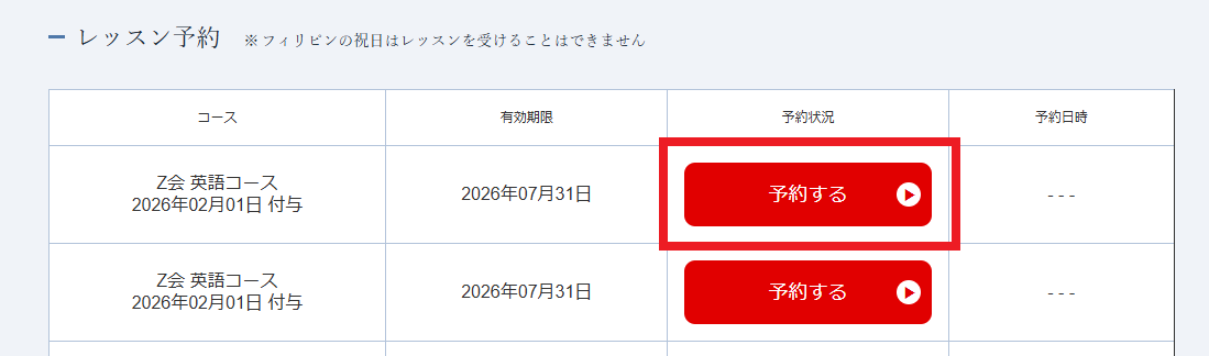 「レッスン予約」にご使用いただけるチケットが表示されますので、右側にございます「予約する」を押すと予約画面に遷移します。