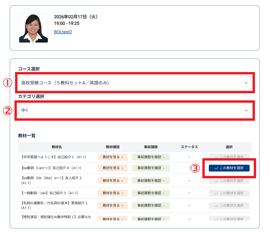 ③教材確定:コース・カテゴリを選択すると教材一覧が表示されます。「この教材を選択」を押して、教材を選びます。教材を選択したら、「予約する」を押して予約を完了させてください