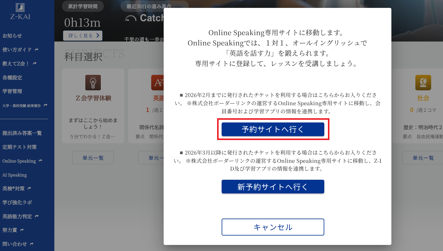 「Z会×ボーダーリンクオンラインスピーキング専用サイト」にジャンプ。