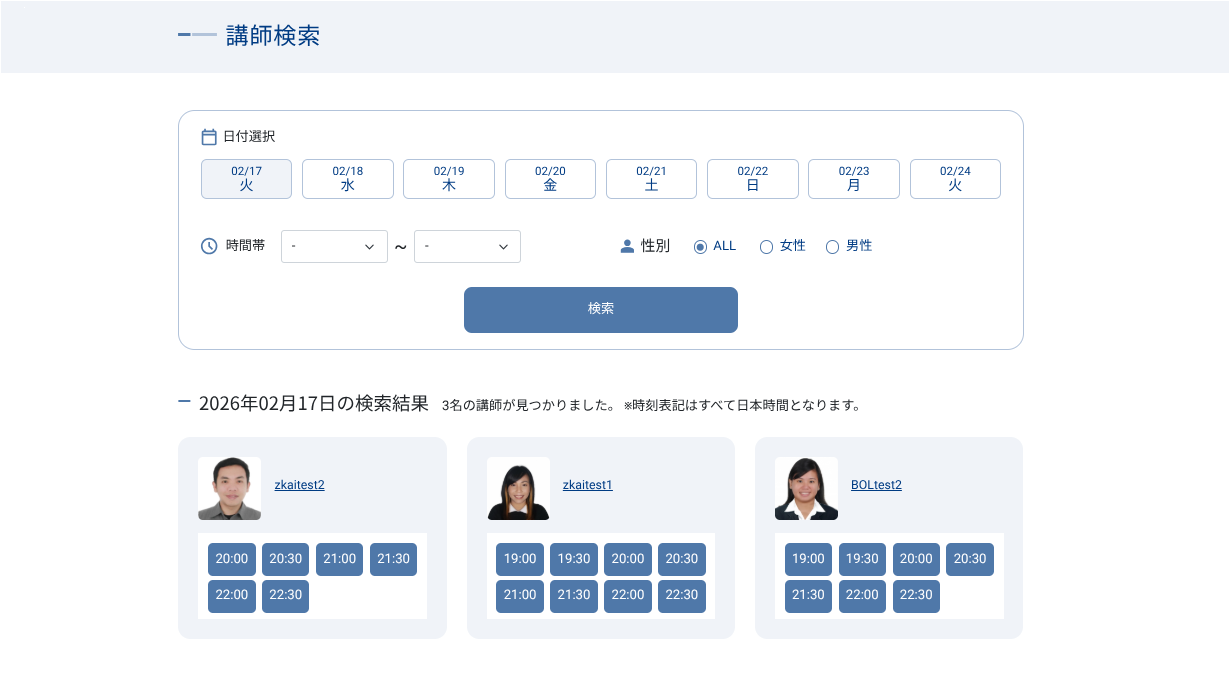 レッスン実施日までに希望日時をスケジュール表から選んで予約します。2週間先までの予約が可能です。レッスンの4時間前まではキャンセルが可能です。