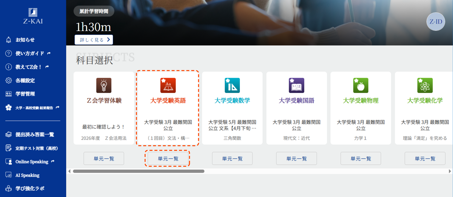 Z会オリジナルカリキュラム(固定)での学習となります。学習進度や学習順序の変更はできません。