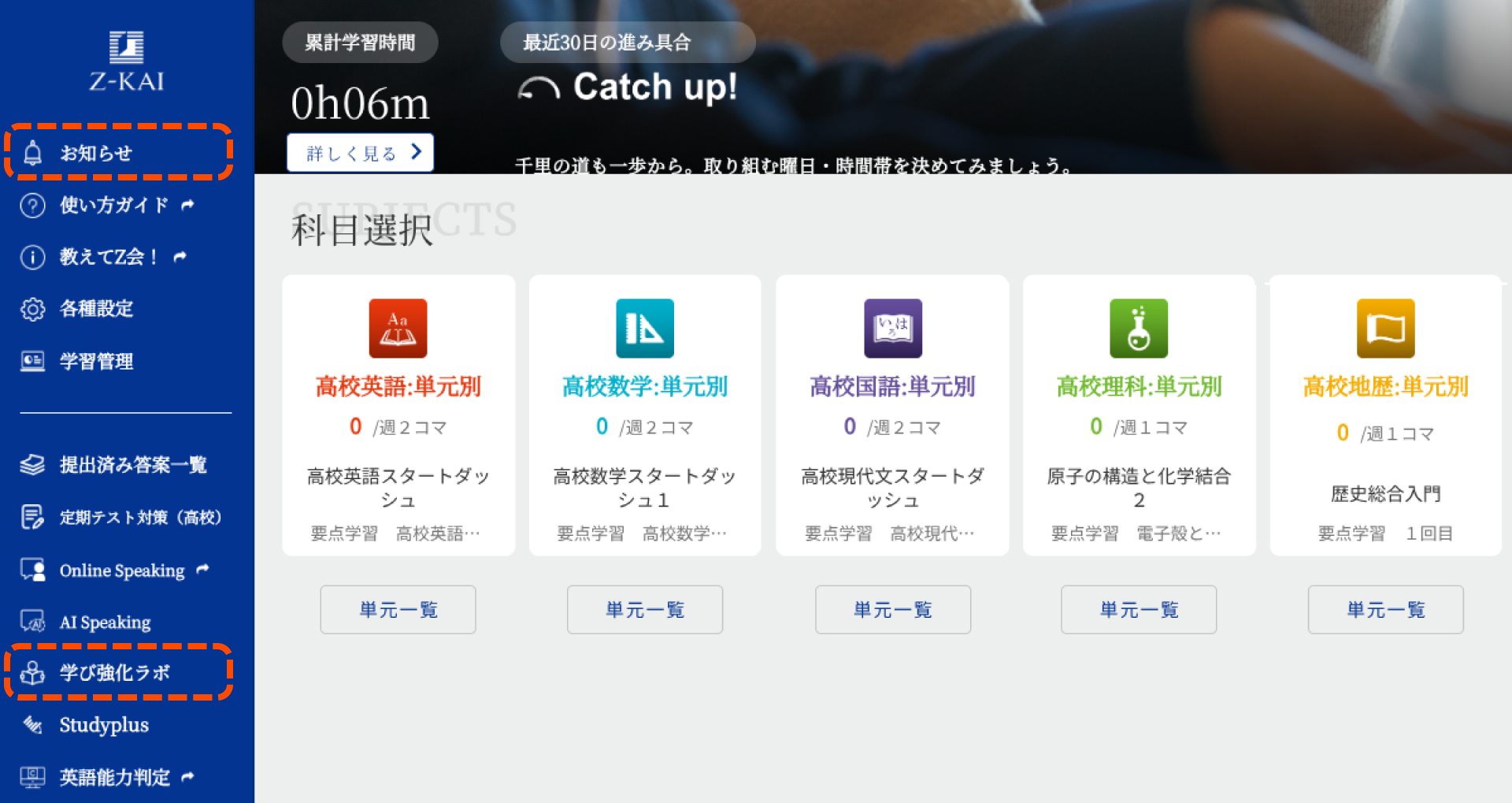配信期間中に、アプリホーム画面の「学び強化ラボ」に入ると、「入試基礎力完成演習」というパネルが表示されています。画面の説明に従って取り組みましょう。