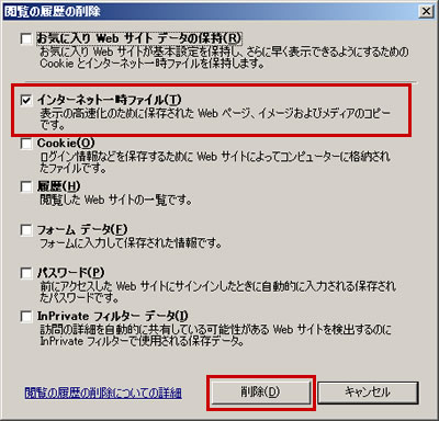 閲覧の履歴の削除の画面が開き、「インターネット一時ファイル」のみにチェックを入れ、「削除」のボタンをクリックします。
